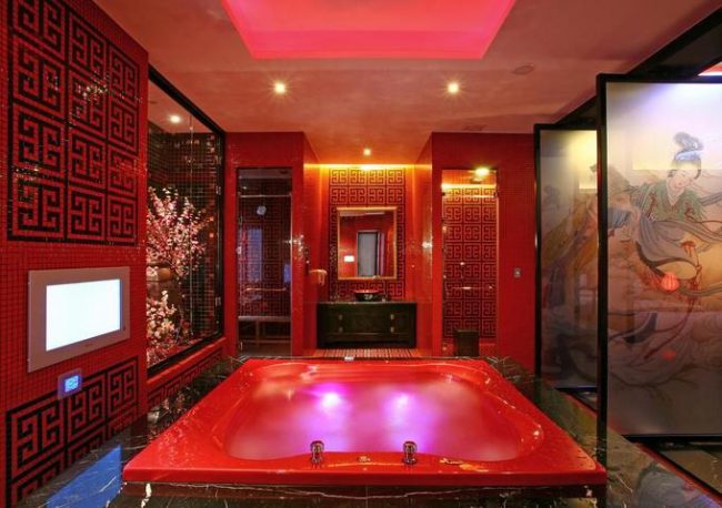 Sato Castle ở Đài Loan được biết đến với những căn phòng độc đáo, nhiều chủ đề khác nhau. Tuy nhiên, nổi tiếng nhất là căn phòng được trang bị bể tắm sục, tường ốp gạch đỏ và TV tích hợp. Ảnh: Booking.