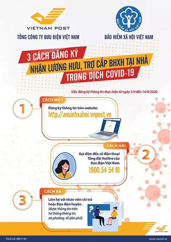– Gọi điện đến Tổng đài của Bưu điện Việt Nam theo số Tổng đài 1900.545481 để được hỗ trợ nhập thông tin lên “Hệ thống đăng ký chi trả lương hưu, trợ cấp BHXH và chi trả bảo trợ xã hội, người có công tại nhà”.