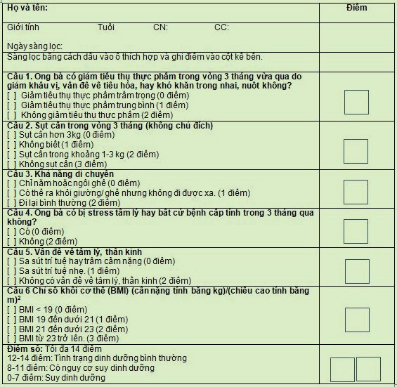 Bảng câu hỏi sàng lọc tình trạng dinh dưỡng MNA-SF: