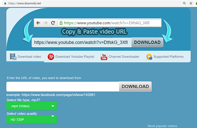 Bước 1: Mở trang www.downvids.net (trang này hỗ trợ tải video Facebook, YouTube và một vài trang khác; có hỗ trợ tải file MP3).
