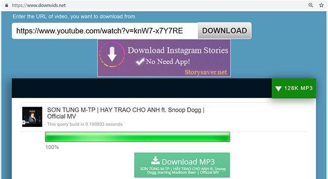 Chờ một chút để trang chuyển đổi, xong sẽ hiện nút màu xanh lá (ví dụ trong hình là chỗ 128K MP3).