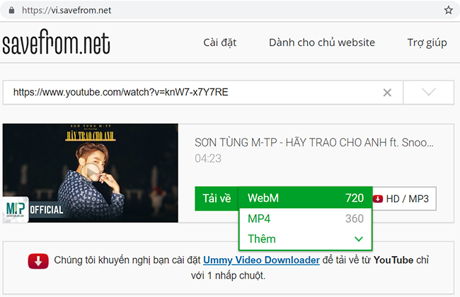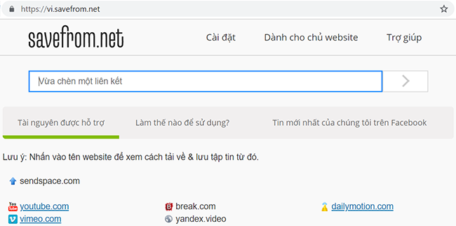 Bước 1: Mở trang www.vi.savefrom.net (trang này hỗ trợ tải video Facebook, YouTube và một vài trang khác; có hỗ trợ tải file MP3).