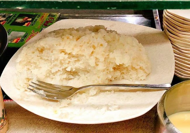 Một món nữa mà khách ưa gọi khi đến đây là xôi xiêm. Vị dẻo mềm của nếp, không quá khô hay nhão; nhân xôi là sầu riêng được làm cô đặc như bánh flan có vị thơm ngậy, phủ lên là nước cốt dừa sền sệt, vị beo béo đang lan khắp dĩa và tìm cách xâm lấn vào từng miếng xôi tùy theo cách múc của thực khách.