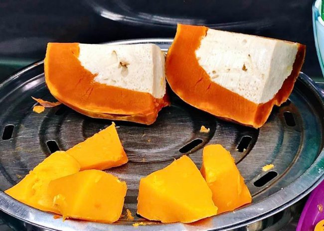 Thực khách thì tỏ ra rất thích thú với món chè bí chưng, tiếng Campuchia gọi là num-à-pơi. Khách ăn không nhớ tên thì cứ gọi nôm na theo kiểu thành phần có gì thì kêu y vậy: bí trứng sữa. Đó là sự kết hợp của bí ngô nhỏ, nạo ruột, thay vào đó là một hỗn hợp sữa bột, sữa đặc, lòng đỏ trứng, nước cốt dừa, đem hấp cách thủy. Hấp xong trái bí vẫn còn nguyên, mềm mà không nhão.