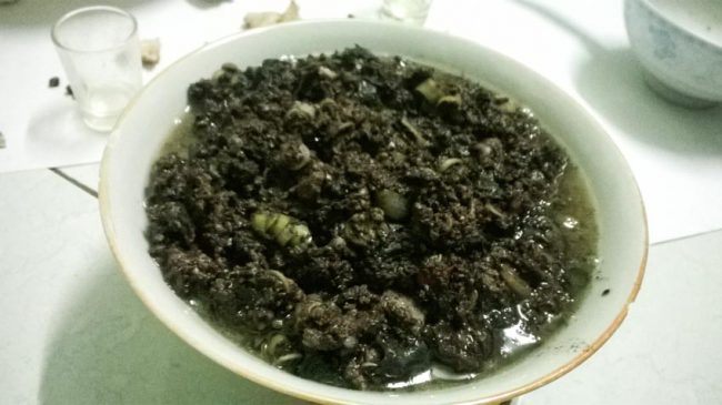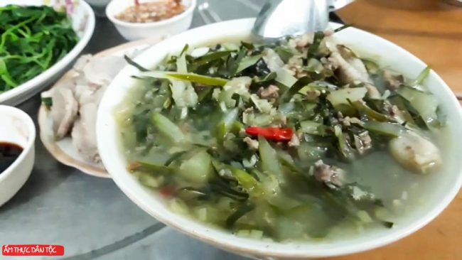 Thịt lợn băm nhỏ, hoặc thịt gà xé tơi, cùng nấm hương và nấm mèo thái sợi đem “phi” hành mỡ, rồi thả lá đắng thái như thái thuốc lá vào. Khi các thứ chín kỹ mới đổ nước sôi vào nấu canh. Canh lúp xúp sôi, đập thêm vài quả trứng vào, khoắng nhuyễn…