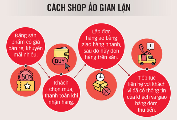 Nhưng hiện nhiều khách chọn trả tiền khi nhận hàng, shop lừa sẽ có thông tin của khách và hủy đơn hàng trên sàn. Sàn sẽ có thông báo qua mail/ứng dụng về đơn hàng bị hủy nhưng ít người mua theo dõi. Lợi dụng điều này, shop lừa sẽ tiếp tục liên hệ với khách và giao hàng dỏm, thu tiền.