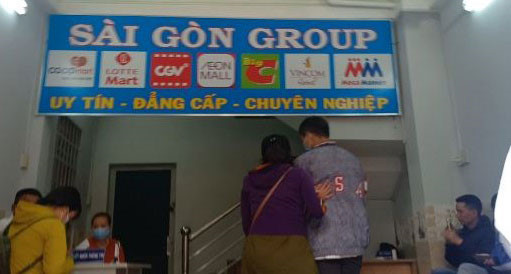 Sáng 5/5, có mặt tại địa chỉ trên, chúng tôi ghi nhận đây là căn nhà phố (1 trệt, 3 lầu), bên ngoài treo bảng Công ty TNHH phát triển quốc tế Sài Gòn Group. Ngay từ cửa vào, công ty này đặt 2 bàn làm việc, có 2 nhân viên liên tục tiếp nhận người lao động đến đăng ký môi giới xin việc làm. Bên cạnh đó, một tấm biển lớn treo giữa căn nhà với hình ảnh logo của Co.opMart, Lotte Mart, CGV, Aeon Mall, BigC… Ngồi vào bàn, chúng tôi được một nam nhân viên phát cho mẩu giấy và yêu cầu điền vào đó những thông tin cơ bản: họ tên, số điện thoại, nơi muốn đi làm, số điện thoại chị Nguyệt (người hẹn phỏng vấn xin việc).
