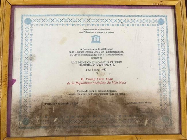 Sau hơn 60 năm cống hiến cho giáo dục, ông Vương Kiêm Toàn, nguyên Tổng giám đốc Nha bình dân học vụ, được UNESO trao bằng khen danh dự năm 1983.