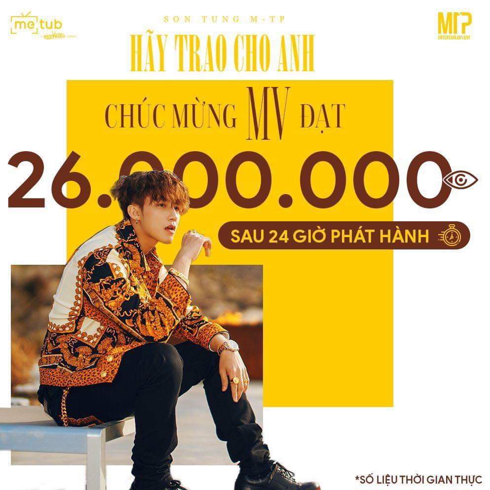 Dù đã được dự báo trước đó về chuyện lượt view, MV Hãy trao cho anh liên tục xô ngã nhiều kỷ lục từ những sản phẩm của chính Sơn Tùng trước đó. Vậy những con số từ Tùng của ngày hôm nay là gì?