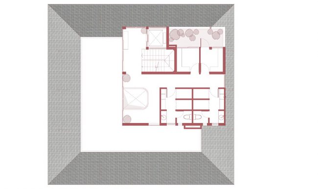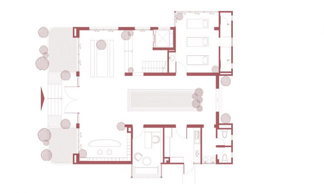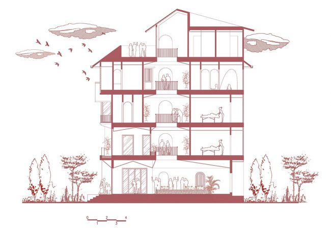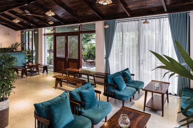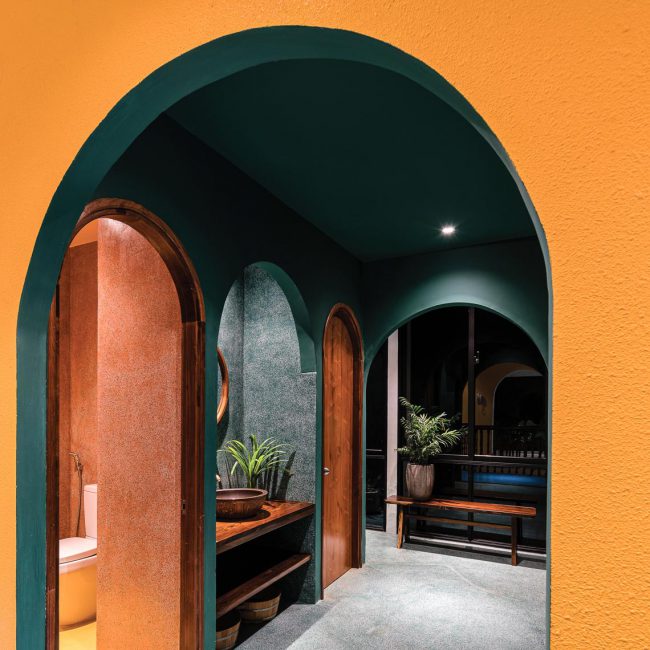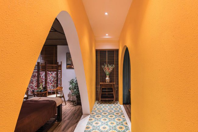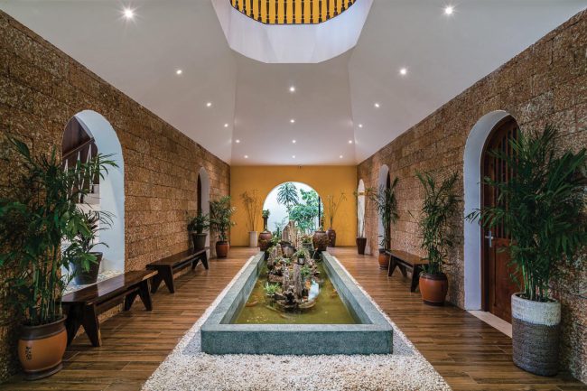 Kiểu kiến trúc truyền thống được vận dụng và tái hiện bằng các hàng hiên từ sảnh đến hành lang chung hay trong các phòng trị liệu, lõi giếng trời trọng tâm ở giữa công trình với hồ nước bên dưới và các phòng chức năng bao quanh. Mỗi trục nhìn xuyên suốt định hình cho từng tầng kết hợp với nhịp điệu cửa vòm đối xứng…
