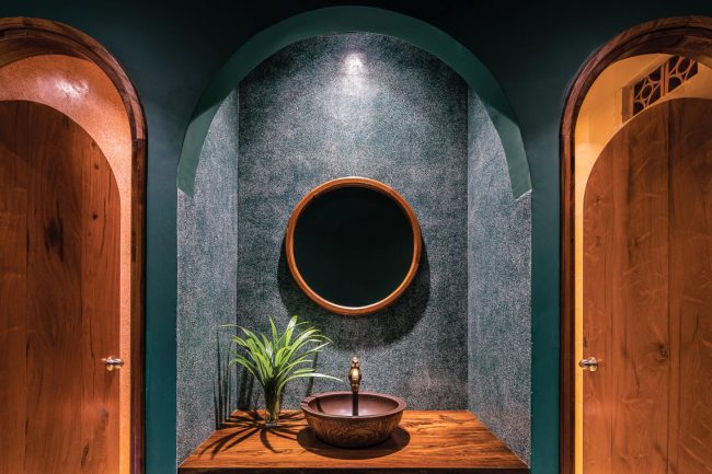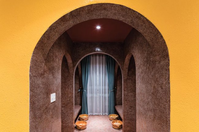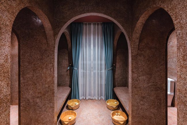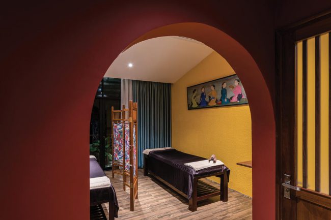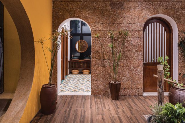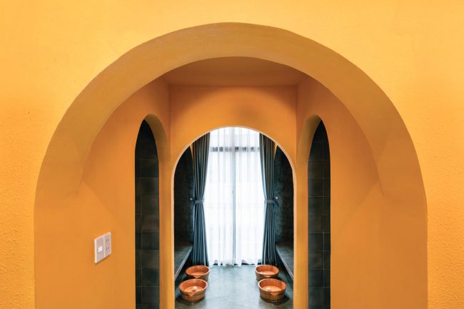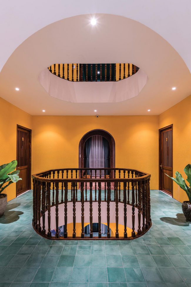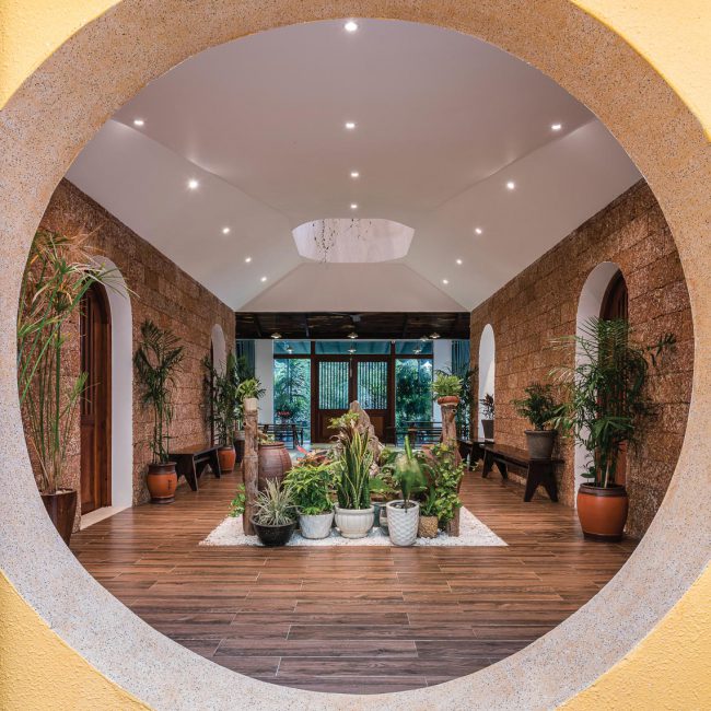 Kiểu kiến trúc truyền thống được vận dụng và tái hiện bằng các hàng hiên từ sảnh đến hành lang chung hay trong các phòng trị liệu, lõi giếng trời trọng tâm ở giữa công trình với hồ nước bên dưới và các phòng chức năng bao quanh. Mỗi trục nhìn xuyên suốt định hình cho từng tầng kết hợp với nhịp điệu cửa vòm đối xứng…