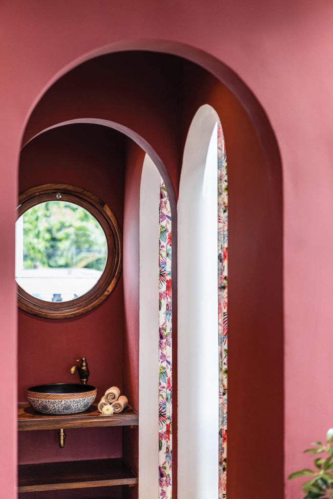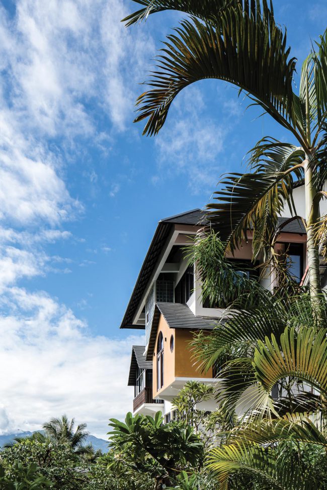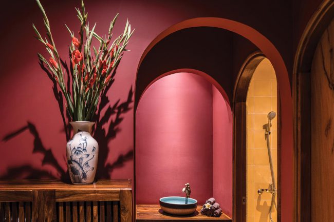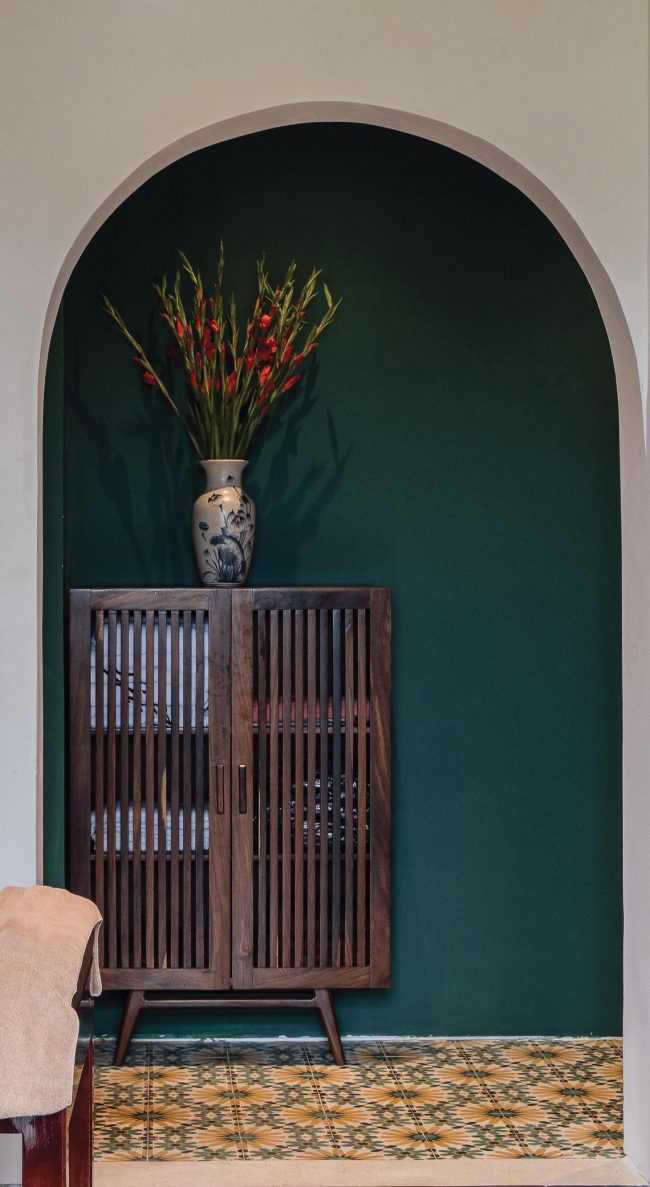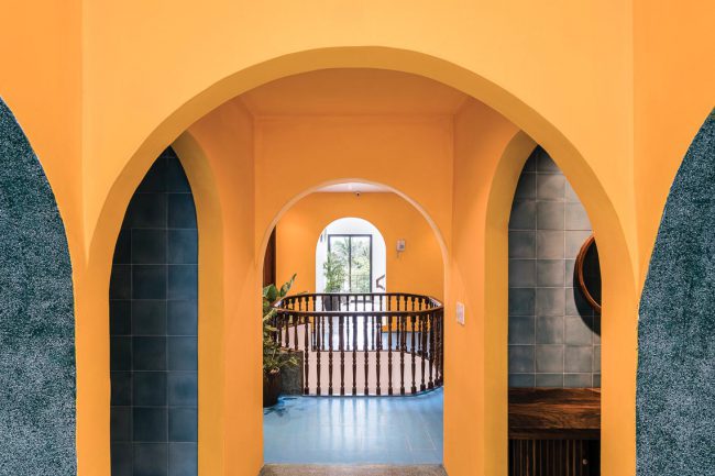 Sắc màu từ chất liệu tự nhiên của đá và gỗ, hay từ độ hoàn thiện thủ công tinh xảo của đá mài truyền thống, gạch bông xi măng; màu sắc tương phản và chuyển tiếp… tất cả được vận dụng xuyên suốt cho quá trình phân chia từng không gian chức năng, phân chia sự chung riêng, phân vùng và chuyển tiếp sáng – tối liên tục theo chiều đứng cũng như theo phương ngang xuyên suốt toàn bộ công trình.