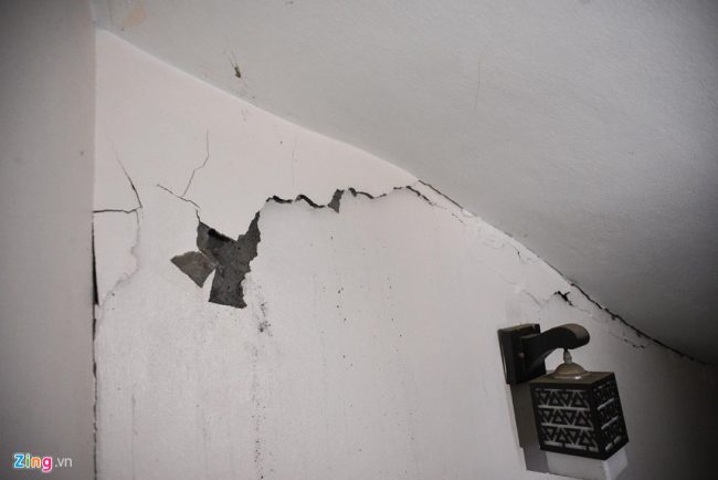 Ngôi nhà của bà Nguyễn Thị Khuyên có bức tường nằm sát với khu nhà kho của công ty Rạng Đông. 10 ngày nay, cả gia đình bà phải di dời toàn bộ, đóng cửa hàng, không dám ở lại vì sợ bị đổ ập xuống bất cứ lúc nào. Ngôi nhà 4 tầng chưa đầy 3 năm tuổi của bà Khuyên bị cháy toàn bộ đồ đạc, cửa kính, bóng đèn vỡ vụn, cột dầm hiện rõ từng đường nứt dài tới cả mét.