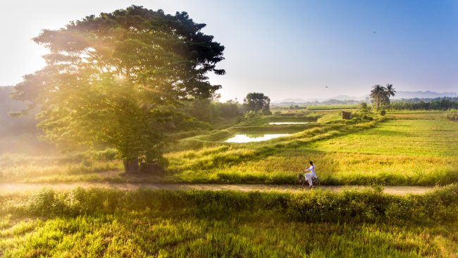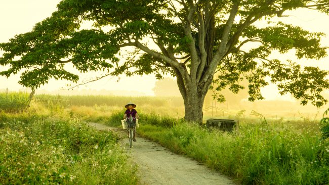 Hình ảnh một cụ già đi làm đồng trong nắng sớm. Ảnh chụp ở xã Quảng Phú, huyện Quảng Điền, tỉnh Thừa Thiên – Huế.