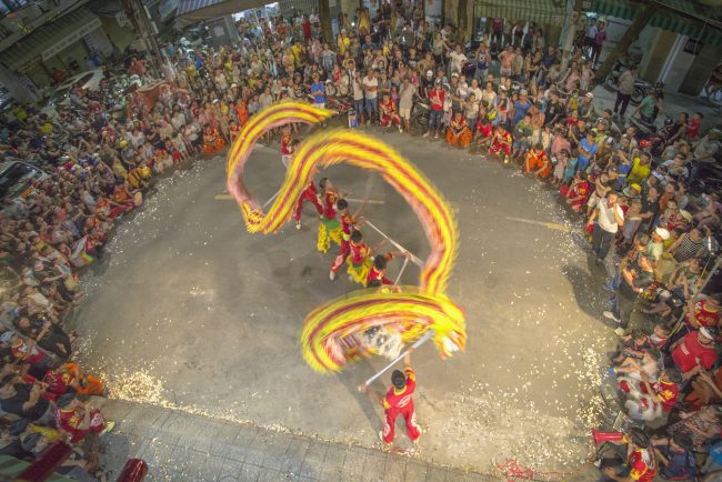 Biểu diễn múa rồng trong đêm Trung Thu trên phố. Ảnh được chụp góc cao tại Đà Nẵng.