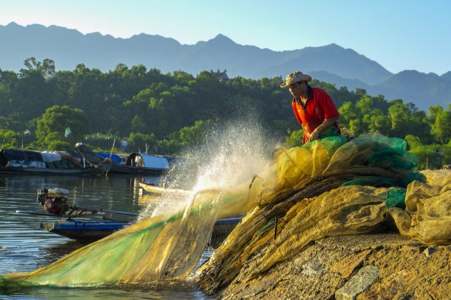 Ảnh chụp ở đầm Cầu Hai, thị trấn Phú Lộc, huyện Phú Lộc, tỉnh Thừa Thiên – Huế  vào ngày 15/5/2019. Người dân đầm Cầu Hai sau một đêm đi kéo lưới về thường giặt tấm lưới để sạch bùn bẩn bám vào lưới, việc này giúp cho việc sử dụng lưới bền hơn. Hình ảnh người ngư dân đứng giặt lưới in hình trên nền trời là một hình ảnh đẹp lọt vào ống kính của chúng tôi khi đi sáng tác.