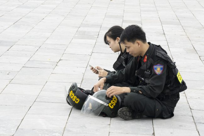 Ảnh chụp ở sân tập Ngọ Môn, Huế. Sau những giờ luyện tập căng thẳng, mệt nhọc, người chiến sĩ cảnh sát cơ động có được những phút giải lao quý giá, họ thư giãn bằng những cách yêu thích của mình như lướt web, thả hồn theo mây gió,… quả thật, trông họ thật đáng yêu.