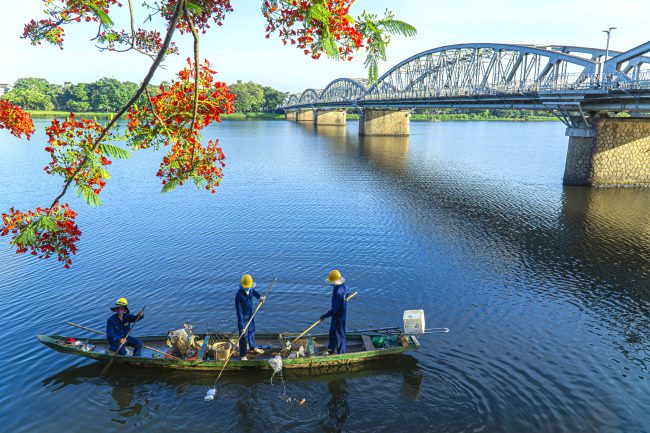 Huế đang phấn đấu trở thành một thành phố xanh – sạch – đẹp. Trong đó, làm cho dòng sông Hương xanh, sạch là một vấn đề được chính quyền và nhân dân thành phố quan tâm. Trong ảnh là cảnh hoạt động của đội vớt rác trên sông Hương vào mùa Hè 2019. Ảnh chụp ở sông Hương, Huế.