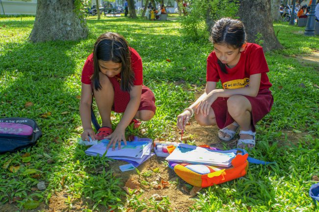 Ảnh chụp ở công viên Tứ Tượng, thành phố Huế, tỉnh Thừa Thiên – Huế vào Chủ nhật ngày 03/11/2019. Tại các công viên ở Huế, vào những ngày Chủ nhật thường có nhiều em học sinh trong các câu lạc bộ đến sinh hoạt. Đến đây, các em được học các kỹ năng hoặc thực hành năng khiếu.