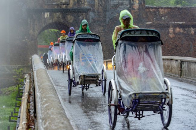 Ảnh chụp ở cửa Thượng Tứ, thành phố Huế, năm 2019. Người lao động đạp xích lô ở cố đô Huế rất vất vả. Vào mùa du lịch, những cơn mưa kéo dài suốt ngày, nhưng những bác đạp xích lô luôn vui vẻ đưa khách tham quan du lịch, rất vất vả khó khăn nhưng đó là niềm vui, sinh kế của người lao động.