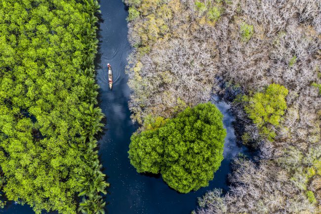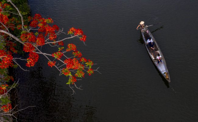 Ảnh chụp ở Rú Chá, huyện Hương Trà, Thừa Thiên – Huế, năm 2019. Vào tháng 10 Thu đến, rừng ngập mặn Rú Chá rụng lá, tạo thành những cảnh quan vô cùng kỳ thú, thơ mộng. Với những bức ảnh chụp từ trên cao, xen lẫn rừng dừa nước, Rú Chá rụng hết lá như bạch dương, xa xa những chiếc ghé đi bắt cá, tôm trên rạch cho ta nhiều cảm xúc khó tả, về sự thơ mộng của thiên nhiên.