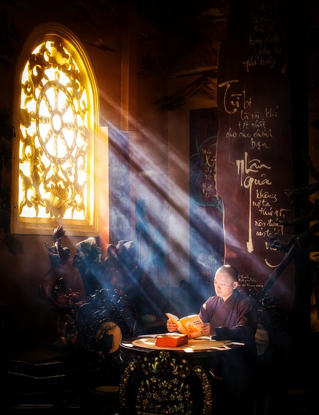 Ảnh chụp tại Đà Lạt – Lâm Đồng ngày 15/2/2019. Sư thầy ngồi đọc sách bên ô của sổ vào một buổi sớm tạo nên một khung cảnh nên thơ.