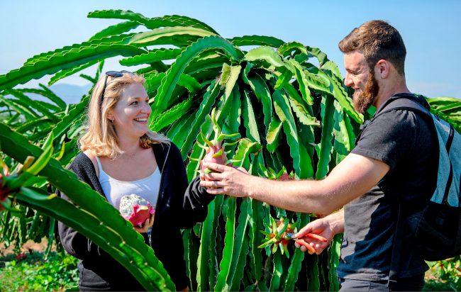 Hai bạn người nước ngoài giới thiệu và chia sẻ cho nhau trái thanh long trong một chuyến đi phượt ở Hàm Thuận Nam – Bình Thuận. Ảnh chụp tháng 5/2019.
