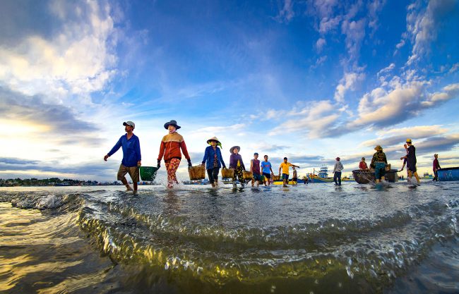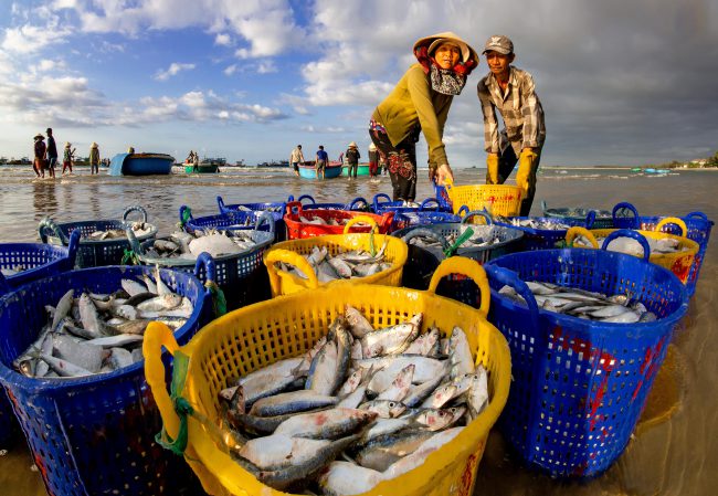 Hình ảnh đẹp mắt khi những sọt cá được ngư dân chuyển từ ghe vào đất liền. Ảnh chụp ở Phan Rí Cửa – Bình Thuận tháng 2/2019.