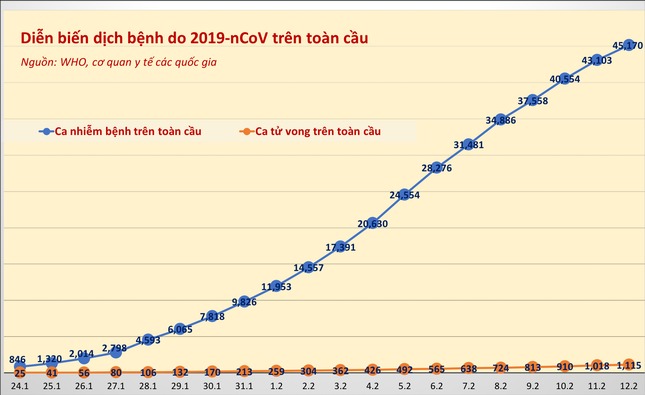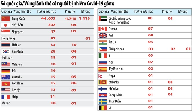 Thế giới đến nay có tổng cộng 45.170 trường hợp nhiễm bệnh Covid-19 và chưa ghi nhận thêm quốc gia nào có trường hợp nhiễm bệnh đầu tiên ngoài 28 quốc gia và vùng lãnh thổ đã có người nhiễm bệnh thời gian qua. Phần lớn những trường hợp nhiễm bệnh mới được báo cáo trong 24 giờ qua đều tại các quốc gia và vùng lãnh thổ châu Á, như Nhật Bản, Hong Kong, Singapore, Thái Lan, Hàn Quốc…