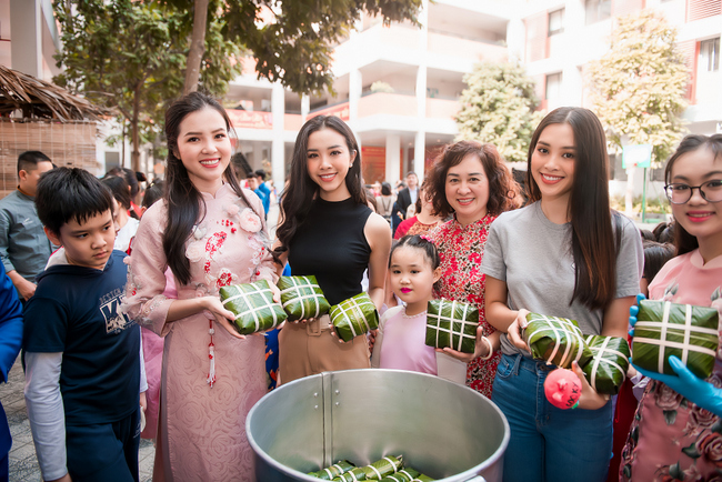 Cô đến trường Tiểu học Chu Văn An (Hà Nội), cùng Á hậu Thuý An và hoa khôi Thuý Vi chung tay gói hàng ngàn chiếc bánh chưng trao tặng trẻ em nghèo. Đây là lần đầu tiên cô gái của xứ sở hay ăn bánh tét ngày Tết đi thử gói bánh chưng ở “thủ phủ” bánh chưng Hà Nội.