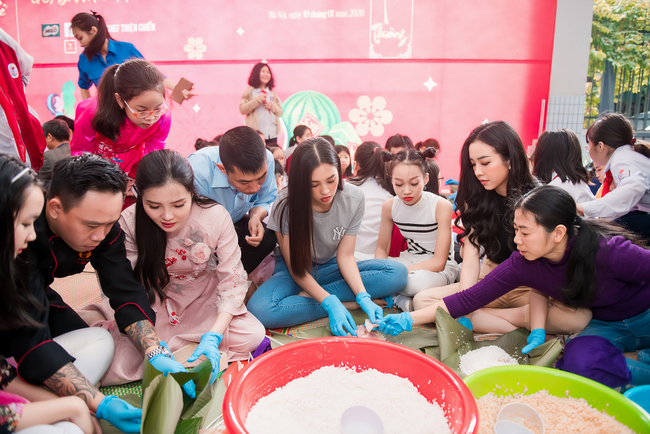 Tết là dịp giới văn nghệ sĩ dành thời gian chung tay cho các công việc thiện nguyện, nên không lạ khi người đẹp xứ Quảng – hoa hậu Tiểu Vy ra Hà Nội gói bánh chưng cho trẻ em nghèo ăn Tết.
