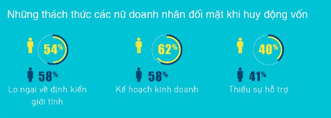 Với sự tham gia của hơn 1.200 doanh nhân (598 doanh nhân nam và 604 doanh nhân nữ) ở cả châu Âu, châu Á, Trung Đông và Hoa Kỳ, báo cáo cho thấy, có đến 58% nữ doanh nhân lo ngại về những định kiến khi huy động vốn. Các thách thức lớn tiếp theo được các doanh nhân nữ cho rằng ở khâu chuẩn bị kế hoạch kinh doanh (58%) và thiếu sự hỗ trợ (41%).