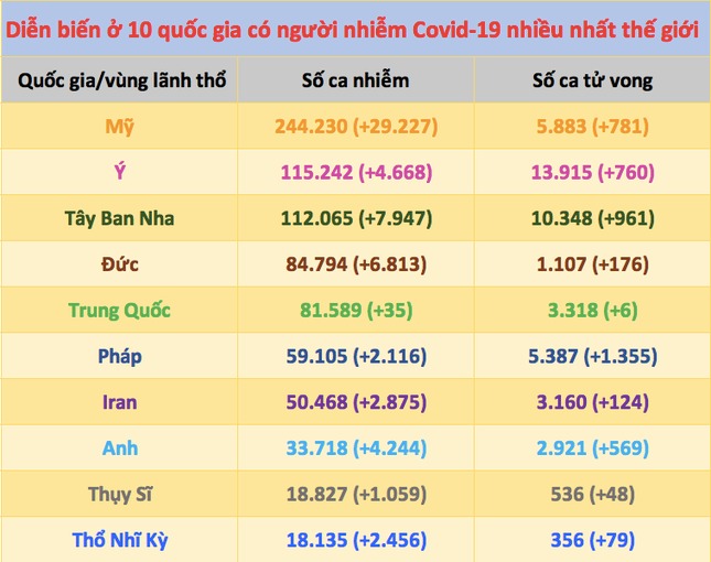 Ở Mỹ, quốc gia có số người nhiễm bệnh cao nhất thế giới, số ca tử vong đã lên mức gần 5.900 người trong tổng số hơn 244.000 người nhiễm bệnh. Trong vòng một ngày qua nước này có thêm 781 ca tử vong và hơn 29.227 ca nhiễm mới. Tỷ lệ tử vong vì đại dịch ở nước Mỹ hiện được ghi nhận là 2,4%.