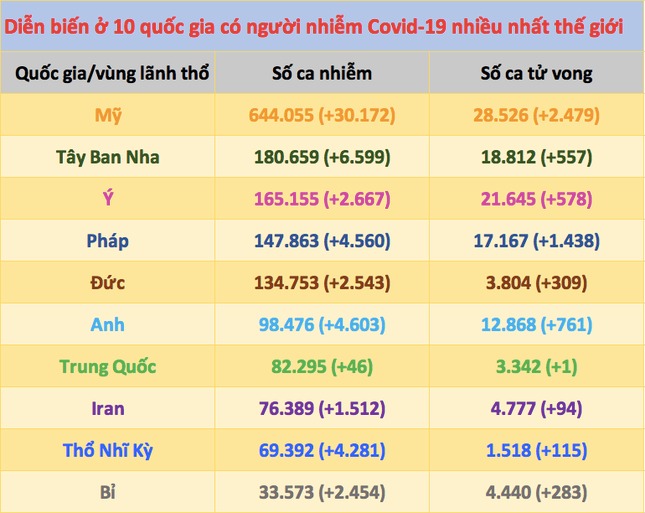 Ngoài Mỹ, trong 24 giờ qua, số ca tử vong tiếp tục gia tăng tại nhiều vùng dịch lớn trên thế giới. Tại Pháp tăng đến 1.438 ca, Anh tăng 761 ca, Ý 578 ca, Tây Ban Nha 557 ca, Đức 309 ca, Bỉ 283 ca, Brazil 225 ca, Hà Lan 189 ca, Thổ Nhĩ Kỳ 115 ca, Canada 107 ca…