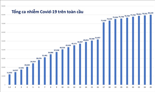 Tính đến 9h30 sáng nay 25/2, hệ thống giám sát bệnh truyền nhiễm Việt Nam ghi nhận thế giới có 80.149 người nhiễm vi-rút corona chủng mới (SARS-CoV-2) gây dịch bệnh viêm đường hô hấp cấp (Covid-19). Đến nay có 2.701 người tử vong, trong đó có 2.663 ca tử vong tại Trung Quốc đại lục.