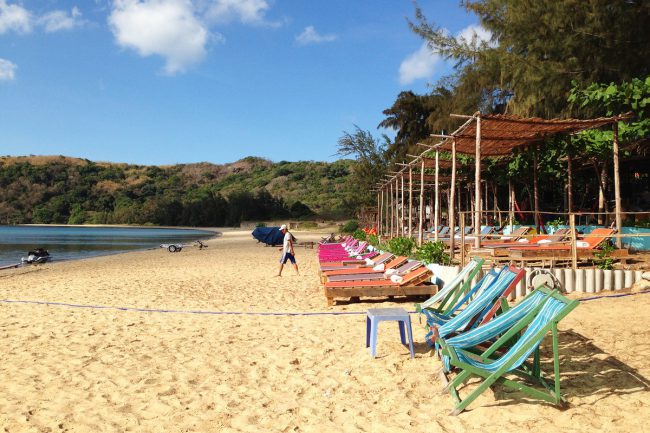 Các bãi tắm trung tâm vịnh Côn Sơn có cát trắng mịn, biển lặng sóng và đông người địa phương đến đây bơi. Trên đường Tôn Đức Thắng ven bãi tắm, bạn có thể hóng mát tại các quán cà phê hướng ra biển.