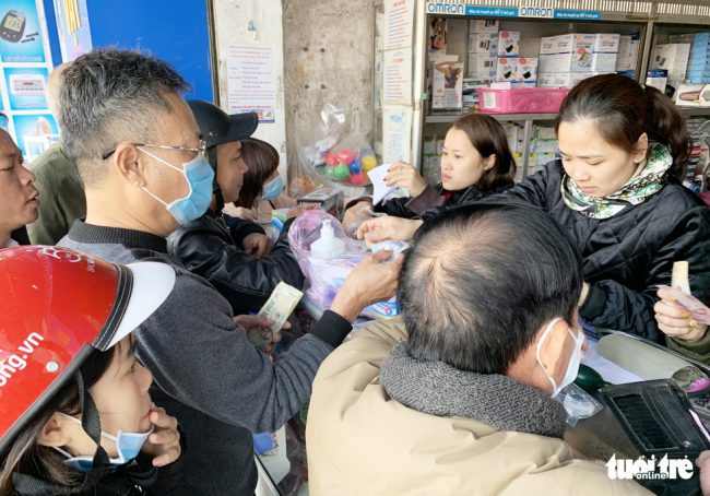 Ghi nhận của Tuổi Trẻ Online, lúc 10h20 sáng 31/1, tại các tiệm thuốc, cửa hàng vật tư y tế lớn xung quanh Bệnh viện Cửa Đông chật kín cảnh người dân đến hỏi mua khẩu trang, dung dịch rửa tay. Nhiều người chen chúc nhau giành mua khẩu trang vì sợ hết hàng.