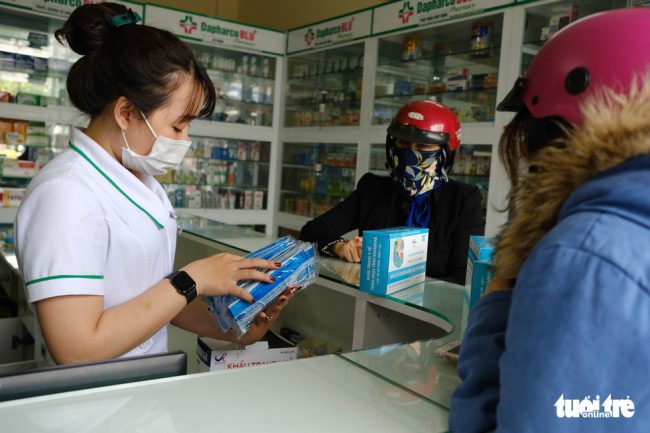 Đứng trong quầy của một nhà thuốc, khách tấp nập hỏi mua khẩu trang, chị Huỳnh Như đáp hết hàng, chờ đến chiều. Theo chị Như, cửa hàng đã bán hết khoảng 5 thùng khẩu trang y tế, mỗi thùng 50 hộp, mỗi hộp từ 20-50 chiếc. “Mấy hôm nay khách toàn mua khẩu trang”, một nhân viên bán hàng cho biết.