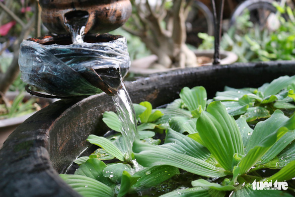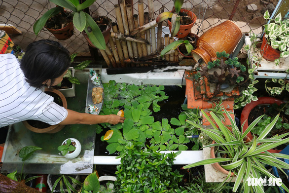 Có lần chị mang chiếc bồn tắm hư bị vứt bên đường về nhà, dùng keo dán lại thả bèo, thả cá, biến thành hồ cá có một không hai.