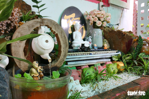 Có khoảng sân rộng 160m², chị Phạm Thị Thanh Thúy (39 tuổi, Q.Thủ Đức) tận dụng làm khu vườn nhỏ, trang trí bằng những món đồ tái chế từ rác thải của gia đình, hay những món đồ chị… lượm từ bãi rác về.