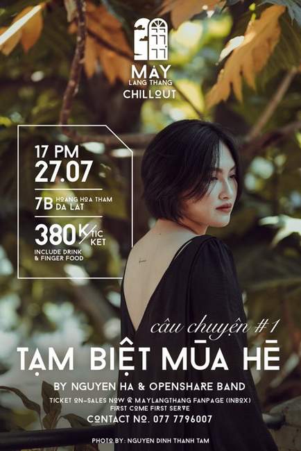 Tạm biệt mùa Hè sẽ diễn ra tối 27/7 tại Mây lang thang, 7B Hoàng Hoa Thám, P.10, TP. Đà Lạt. Được biết, Tạm biệt mùa Hè là số đầu tiên của quán nhạc này, trong một chuỗi những đêm nhạc nhỏ gọn ấm cúng theo từng chủ đề riêng mỗi cuối tháng, với những ca sĩ có thể không nổi tiếng nhưng là những giọng ca có cá tính của nhạc Việt.