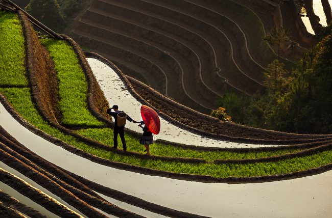 Tình yêu miền sơn cước – Tác phẩm được chụp ở Mù Căng Chải, Yên Bái vào đầu tháng 5/2019. Cứ đến nửa đầu tháng 5 hàng năm là mùa nước đổ ở ruộng bậc thang trên khắp các tỉnh vùng núi phía Bắc Việt Nam. Các nhiếp ảnh gia tập trung về đây để săn những khoảnh khắc phong cảnh và cuộc sống của đồng bào vùng cao. Trong một lần chụp hoàng hôn ở Sán Nhù, Mù Căng Chải, tôi đã gặp được một đôi trai gái người H’Mong nắm tay nhau đi trên ruộng bậc thang…