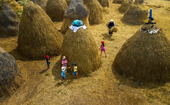 Bình dị một làng quê ở Nam Trung bộ – Tác phẩm được chụp ở Tuy An, Phú Yên vào tháng 5/2020. Tôi tình cờ đi qua một xóm nhỏ để vào chụp Gành Đá Dĩa thì bắt gặp một nhóm trẻ thơ đang chơi đùa quanh các ụ rơm.Tôi đã bay flycam để ghi lại khoảnh khắc này. Và tôi phát hiện có một cụ già đang gánh rơm. Thế là một ý tưởng về nét bình dị của một làng quê bắt đầu…