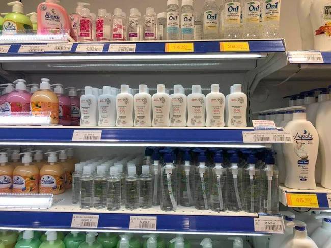 Có thể nhìn tâm lý bình tĩnh đám đông qua gian hàng nước rửa tay. Cứ mỗi đợt có thông tin về Covid-19 gây ồn ào là y như rằng các kệ hàng này nhanh chóng sạch sẽ.