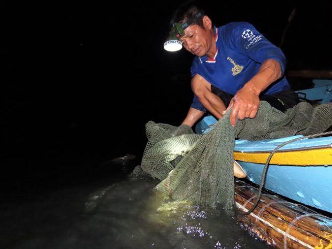 Chạy gần 1 tiếng đồng hồ, anh Hoành giảm ga, sửa soạn giạ (một loại lưới) thả xuống biển bắt đầu đánh. Tôi giúp anh giữ đe cho cân bằng. Thả giạ xong, anh chỉnh ga cho xuồng chạy với tốc độ khoảng 2 – 3 hải lý/giờ. Cứ thế, xuồng chầm chậm chạy dọc theo lọn nước ven bờ.