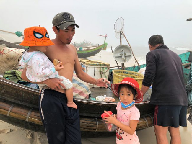 Cũng như anh Hoành, ngư dân bãi ngang Hải Ninh ai nấy quần quật đánh bắt. Trời tờ mờ sáng, tôi gặp ngư dân trẻ Nguyễn Văn Phong vội vàng chuyển đồ xuống bờ rồi thay bình ắc quy của xuồng do vợ Trương Thị Hoàn mang xuống để kịp quay ngược ra lại biển xúc ruốc. Xuồng chồng rời đi, chị Hoàn mới yên tâm quay lên. Chị đặt bình ắc quy một đầu, tôm cá một đầu rồi gánh về nhà. Dáng chị gầy nhom, tưởng như oằn cong trên cát.