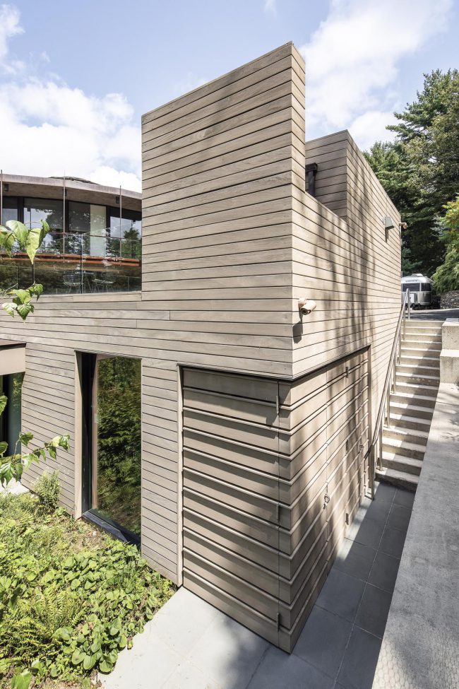 Ngôi nhà có một hệ thống kết cấu thép, nằm trên một vòng bi rộng 4,2m. Phần bên ngoài nhà được giữ bởi các móc treo kết nối với mái nhà trong khi bề mặt được bao bọc bởi kính và gỗ tuyết tùng.