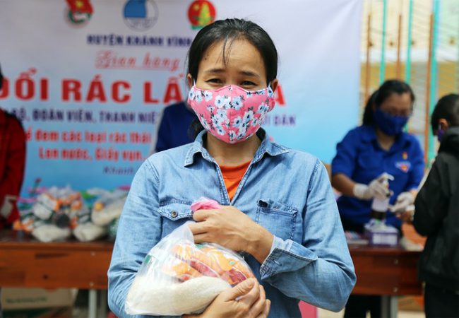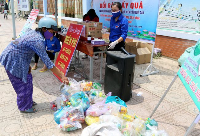 Ảnh hưởng Covid-19, nhiều người không có việc làm, mất thu nhập, phải đứt bữa. Hàng chục người xếp hàng đổi rác lấy quà. Ai nấy đều đeo khẩu trang và giữ khoảng cách. Một vài trường hợp không có khẩu trang, đoàn viên cầm nước kháng khuẩn hướng dẫn rửa tay, tặng khẩu trang cho họ.