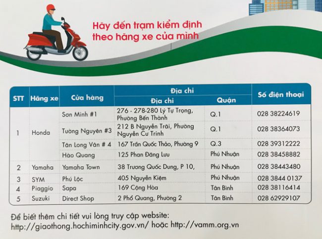 Cụ thể, từ nay đến hết tháng 9, người dân trên địa bàn TP.HCM sẽ được kiểm tra khí thải miễn phí tại 8 đại lý bảo dưỡng, sửa chữa thuộc 5 hãng xe bao gồm: Honda, Yamaha, SYM, Piaggio, Suzuki trên địa bàn 4 quận: 1, 3, Phú Nhuận, Tân Bình.