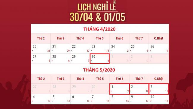 Sau dịp nghỉ Tết Nguyên đán Canh Tý, đợt nghỉ lễ Ngày giải phóng miền Nam 30/4 và Ngày Quốc tế lao động 1/5 là kỳ nghỉ dài thứ hai trong năm 2020. Kỳ nghỉ này diễn ra trong bối cảnh cả nước vẫn đang tập trung phòng chống dịch Covid-19.